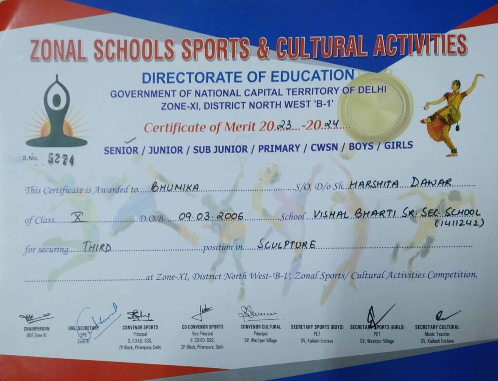 नई दिल्ली,(Shah Times) । जोनल XI नॉर्थवेस्ट नई दिल्ली से कम से कम 40 स्कूलों में कुल 200 से 300 छात्रो में सीनियर विंग में भूमिका डावर ने तीसरा स्थान हासिल किया।