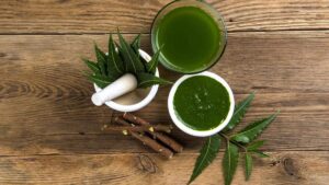 नीम की पत्तियों में रोग प्रतिरोधक क्षमता बढ़ाने वाले तत्व होते हैं, जो शरीर को संक्रमण से बचाते हैं और सर्दी-खांसी जैसी समस्याओं से राहत दिलाते हैं। नीम का जूस बनाकर नियमित रूप से सेवन करें। नीम की पत्तियों को काढ़े के रूप में उबालकर पिएं।