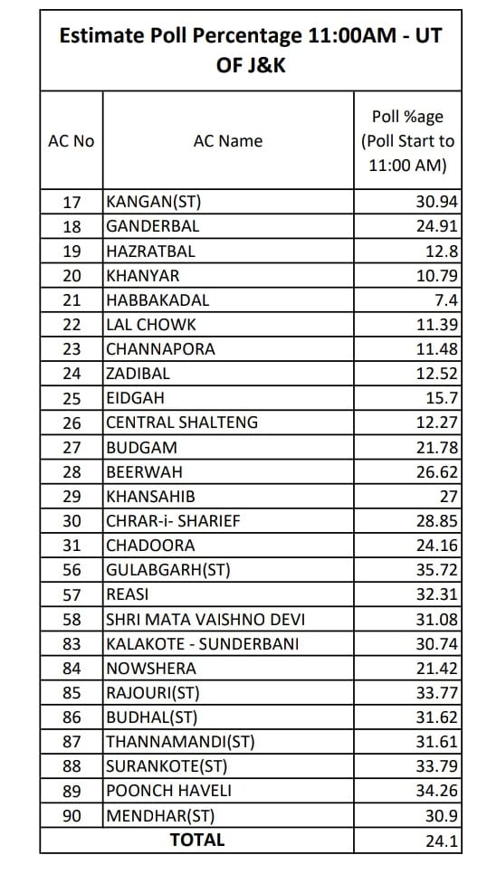 चुनाव आयोग की और से जारी आंकड़ों के अनुसार सुबह 11 बजे तक 24.10 प्रतिशत मतदान हुआ है। अधिकारियों के अनुसार मतदान केंद्रों पर कड़ी सुरक्षा के बीच सुबह सात बजे मतदान शुरू हुआ। उन्होंने बताया कि जम्मू की सुरनकोट सीट पर सबसे अधिक 14.57 प्रतिशत मतदान हुआ, जबकि पुंछ हवेली में 14.56 प्रतिशत वोट पड़े। कश्मीर घाटी में 15 विधानसभा क्षेत्रों में सबसे अधिक कंगन सीट पर 13.52 प्रतिशत मतदान हुआ है। इसके बाद चरार-ए-शरीफ में 13 प्रतिशत और गांदेरबल में 12.06 प्रतिशत मतदान हुआ है। उन्होंने बताया कि हब्बकदल निर्वाचन क्षेत्र में सबसे कम 2.63 प्रतिशत मतदान हुआ।